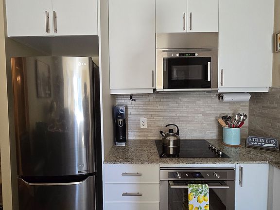 Expansive windowsTwo large sliding doorsModern l-shaped kitchenGranite countersAmple prep spacePremium stainless steel appliancesCounter-depth fridge