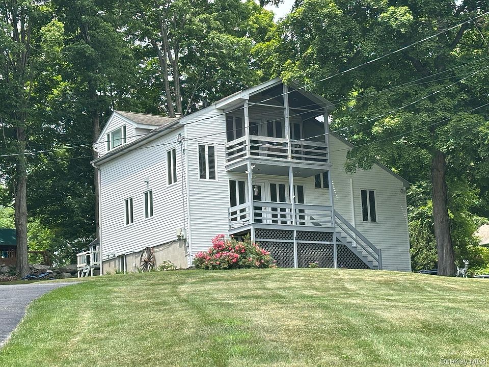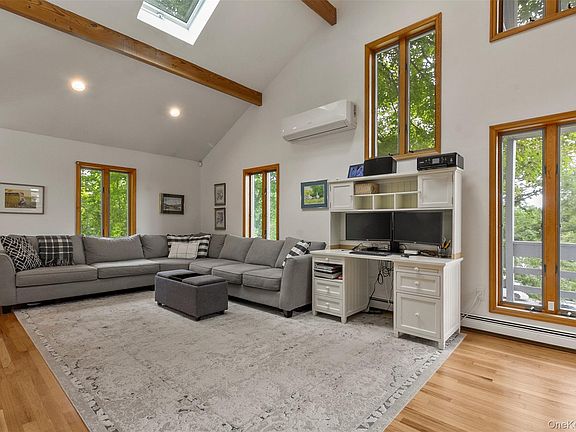 Bright and contemporary with mountain views, this beautifully built home is set at the end of a cul-de-sac and features a balcony + two decks! The living area offers soaring ceilings and a wonderful open feel. High-end Andersen casement windows are found throughout, along with stunning oak hardwood floors. The main level includes a sun-filled living room, dining area, bright eat-in kitchen, and doors out to the two spacious decks & outdoor living area. Also on first floor is the primary bedroom and full bath. Upstairs, you’ll find two additional bedrooms, a full bath with double sinks, and access to the balcony. Energy efficiency is top-notch with a Bosch heat pump, providing both heating and A/C. The basement includes a versatile playroom/home office (300 extra sq ft, not included in the total shown above) + laundry area, half bath, and attached 2-car garage. Located in the Mahopac School District, the home is part of a private community with beach access on Kirk Lake.