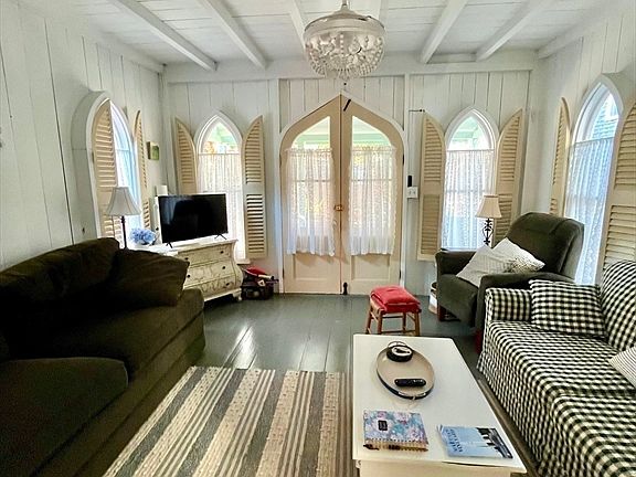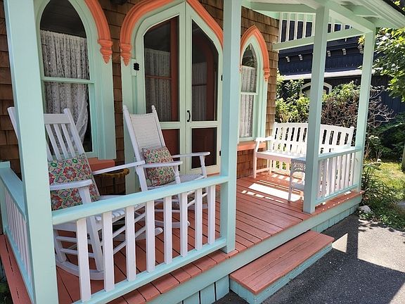 Gingerbread Cottage full of character and personality! Part of Martha's Vineyard Camp Meeting Association, this Oak Bluffs seasonal antique with beautiful trim and scrollwork sits on a lovely little avenue. The cottage features charming period details, a covered front porch with rocking chairs & upper balcony. Step inside the unique front door into a cozy living room enhanced by beamed ceiling, painted wood floors & lovely shutters. First floor bedroom, full bath & laundry. The kitchen offers access to private courtyard with stone patio for outdoor dining & storage shed. Second floor includes front bedroom with access to the private balcony & a 3rd bedroom. Too many updates to list! Ask agent! Home is just steps from historic Trinity Park & the Tabernacle, which offers community events & activities for all ages! Prime location near Circuit Ave in the heart of Oak Bluffs gives easy walkable access to beaches, restaurants, ice cream, shopping, arcade, ferries & island transportation!