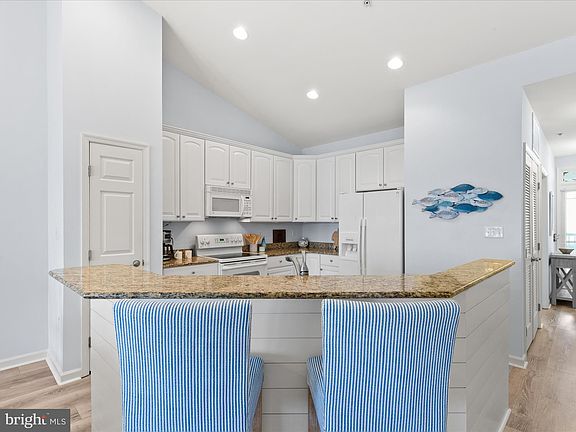 Exquisite Coastal Condo in Sunset Island – Ocean City’s Premier Resort Community Modeled after a famous theme park resort, Sunset Island is a one-of-a-kind gated community that feels like a charming Southern town. Picturesque streetscapes, clamshell walkways, and vibrant landscaping lead to a premier bayfront retreat with world-class amenities-just minutes from the heart of Ocean City. This furnished fourth-floor condo captures the essence of coastal living with cheerful colors, abundant natural light, and thoughtful design. Luxury vinyl plank flooring flows throughout, tying the space together with a clean, modern look. The heart of the home is its open living concept, where the kitchen, dining, and living areas blend seamlessly beneath vaulted ceilings and recessed lighting. The kitchen offers both style and function with crisp white cabinetry, granite countertops, a center island with double sink, breakfast bar, pantry, and white appliances. The living room invites you to gather around the built-in electric fireplace or step through the slider with transom window onto the balcony. The primary suite is a private retreat, complete with a raised tray ceiling, walk-in closet, and a spacious en suite bath featuring double vanities, a soaking tub, and separate shower. From here, you can slip out to the balcony with your morning coffee, watching the sun sparkle on the pond while listening to the soft splash of the fountains. Two additional bedrooms and a full hall bath provide plenty of space for family and guests, each room designed with comfort in mind. Every piece of furniture and décor has been carefully chosen in a coastal style, creating a warm, inviting space that feels like home from the moment you arrive. For added convenience, your own private, secure storage unit in the parking garage is perfect for bikes, paddleboards, and beach gear. Life in Sunset Island is about more than just a home-it’s about a lifestyle. Here, every day feels like a vacation. Swim in the indoor or outdoor pools, sunbathe on the private bay beach, launch a kayak from the pier, or explore scenic walking and biking paths. Evenings bring neighbors together for movie nights with ice cream by the water, while annual traditions like the 4th of July parade and Easter Egg hunt create a true sense of community. The clubhouse features a fitness center, convenience store, and restaurant, while 24-hour security ensures peace of mind. And when you’re ready for the lively energy of Ocean City, the beach and boardwalk are only a few blocks away. Whether you’re seeking a year-round residence, a gathering place for family and friends, or a smart investment opportunity, this condo delivers. With its thoughtful updates, comfortable layout, and unbeatable location in one of the most coveted resort communities on the coast, Sunset Island truly offers coastal living at its finest.