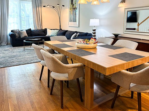 Very unique space found in the heart of Brookline Village, over 2000 sq ft of living space. Found on the second floor. This townhome offers high ceilings, gleaming hardwood floors and central air. first floor features living room with a sleeper sofa, TV, dining room with dining table, fully equipped kitchen, full bathroom and bedroom with a queen bed. Second floor features French doors that open to a den /bedroom. Queen-sized Murphy bed with sofa allows guests to use this space as a second living room or private bedroom. The third bedroom features a king bed with views of Brookline Village, and a full bath and private deck are all found on the second floor. A coin-operated laundry is located on the ground floor of the building.