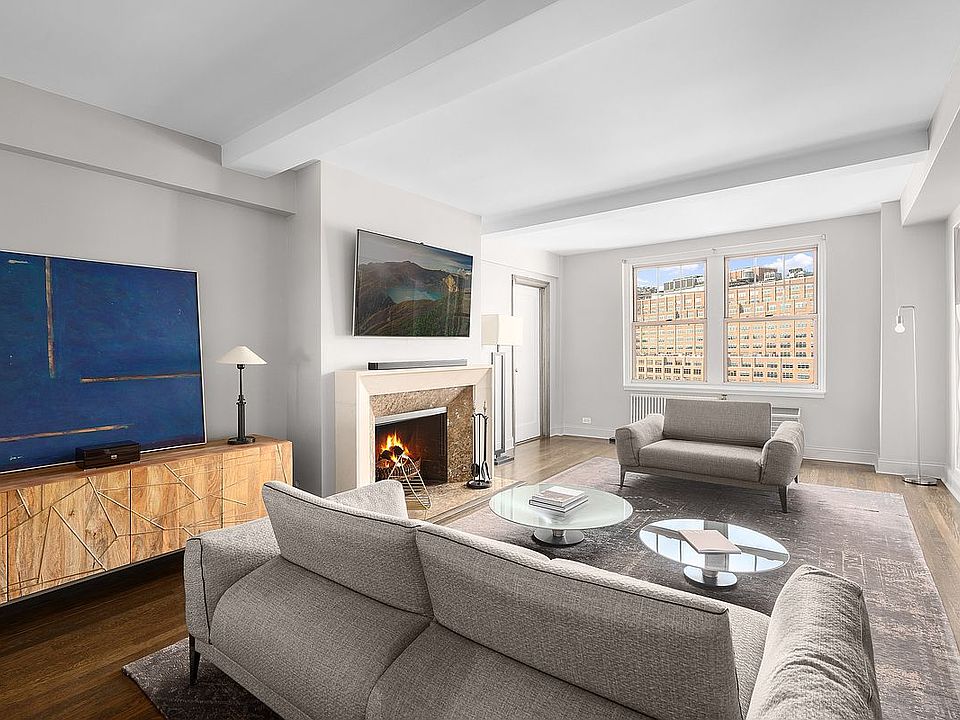 The 22-foot living room is anchored by a working wood-burning fireplace and oversized windows that flood the space with natural light. Prewar details include beamed ceilings, original steel door frames, and oak hardwood floors, while three California closets—including two walk-ins—provide exceptional storage. The king-sized bedroom enjoys open northern exposures and direct access to a marble-clad bathroom, complemented by a through-wall air conditioning unit. The windowed galley kitchen is outfitted with stainless steel appliances, custom cabinetry, granite countertops, and a wine fridge.