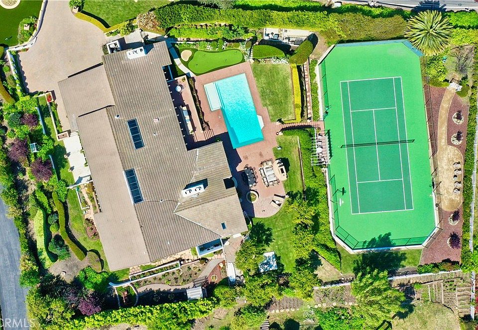 Located in the private guard gated community of Rolling Hills, lies this move-in condition 5 bedroom, 5 bath estate situated on an elevated 1.2 acre lot overlooking city, ocean and mountain views. Massive custom glass double door entry opens to an impressive light filled interior featuring volume ceilings and grand scale throughout. This spacious open concept design showcases, many skylights, volume ceilings, large rooms, and walls of glass to bring the outdoors in. Large picture windows and sliding glass doors are a natural extension of our easy going California Lifestyle. The Chef's delight center island kitchen with Professional Thermador cooktop, full size Sub Zero, and tons of cabinetry, opens to a sunny eat-in area and spacious great room with fireplace, two story high custom built in bookshelves and views of the expansive entertainer's yard. Elegant formal dining room, step down living room with another fireplace, and a grand piano terrace under multiple skylights. There are four generous sized ensuite bedrooms plus a sumptuous primary suite with fireplace, spa style bath with soaking tub, and huge walk-in-closet. Private entertainers backyard complete with outdoor sitting areas, fireplace, built-in BBQ, putting green, rose garden & orchard, bar area with 3 refrigerators, and an inviting pool with a beach shelf, and ample grassy play area plus a north/south tennis court. Expansive 3 car garage with lots of storage and a paver driveway. Community offerings include pickle ball courts, tennis courts, multiple horse arenas and miles of riding trails. Serviced by the award winning Palos Verdes School District and located within minutes from Rolling Hills Country Club, The Jack Kramer Club, Trump Golf Course and Terranea Resort.