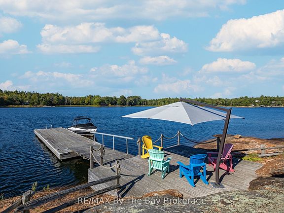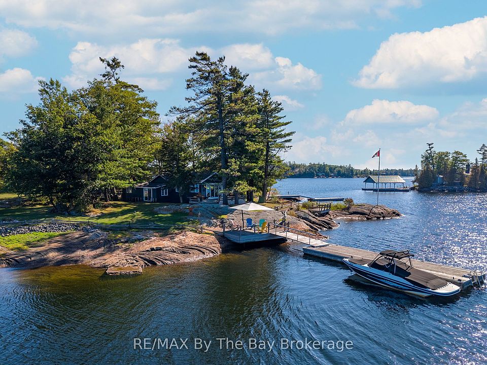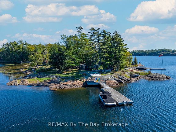 Welcome to one of the most unique private islands in the Honey Harbour area - 1.4 acres of natural beauty with an impressive 1,256 feet of shoreline, featuring a mix of rocky outcrops and sandy beaches. Located just five minutes by boat from the marinas of Honey Harbour, this island offers the perfect blend of seclusion and accessibility in the coveted North Bay. At the heart of the property is a charming 4-bedroom, 2-bathroom cottage with a timeless heritage feel. Inside, you'll find original wood floors, an open-concept kitchen, and expansive living and lounging areas centered around a classic granite fireplace. A separate window-wrapped dining room invites you to enjoy panoramic views of the surrounding landscape and waterfront while you dine. The cottage is surrounded by beautiful ornamental bedrock and lush, grassy meadows, ideal for casual strolls, games of catch, or a family badminton match. Expansive decks wrap around the home, offering abundant space for outdoor dining, relaxing, and entertaining. A spacious guest cottage adds flexibility for hosting, featuring 1-bedroom and 2-double bunk beds, perfect for additional family or guests. Whether you're looking for a peaceful family getaway or a one-of-a-kind venue for an unforgettable celebration, this property delivers. Its privacy and natural beauty make it ideal for intimate weekends, while the expansive grounds can easily accommodate outdoor events for up to 200 guests, perfect for a destination cottage wedding or party.