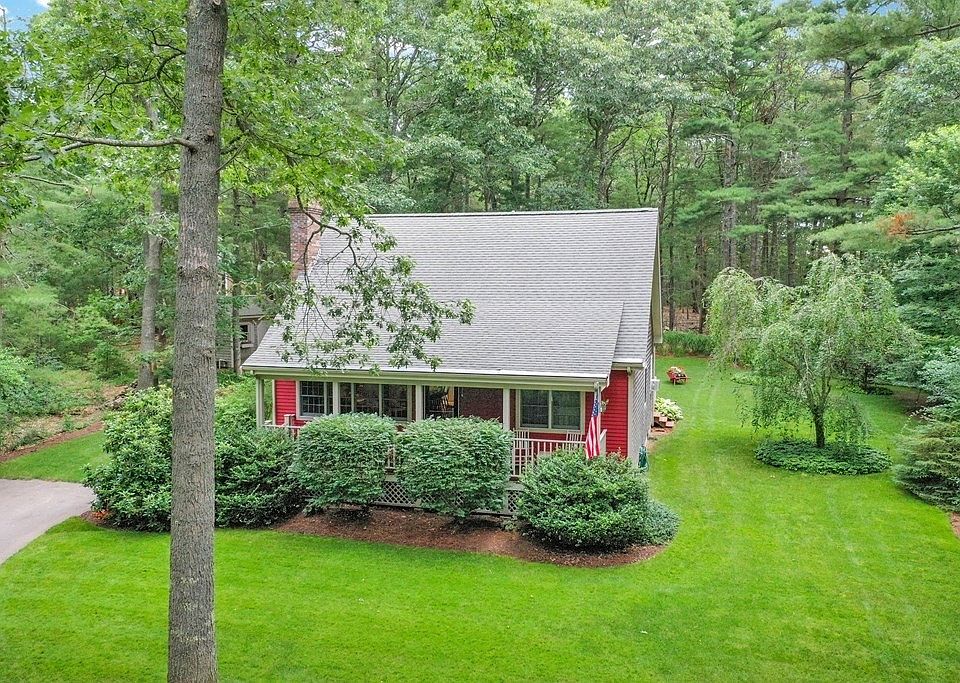 Privacy and serenity abound in this retreat like setting for this New England charmer! The residence awaits at the end of a winding private drive, trees up lit during the evenings upon arrival. This home is well maintained and loved with abundant living areas. Main level offers living room with cathedral ceiling, hardwood flooring, brick wood burning fireplace. The updated kitchen features granite counters, GE appliances and a walk-in pantry w/laundry. The first floor en-suite bedroom includes a soaking tub, shower and walk in closet. Second level features two additional bedrooms with a nook loft overlooking the living area. Lower level is partially finished with a game room/family room, work area and plenty of storage. Enjoy peaceful walks in the abutting conservation area or around the private executive cul-de-sac neighborhood or simply relax by the firepit, come make your own special memories here in this extraordinary home. Sampsons Pond is close by & fully recreational.