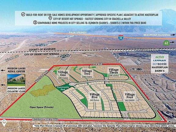 SUNSET RIDGE offers a rare approved Specific Plan on 160+/- Gross Acres (not all developable) located within in the City of Desert Hot Springs within minutes of Downtown Palm Springs. The previous Tentative Tract Map was approved for 5,500 to 16,000 sf. lots however the low density residential zoning allows up to 5DU/acre which in theory could yield as many as 800+/- potential units (Buyer to Verify). This opportunity is ideal for a build-for-rent developer, or homebuilder. With panoramic mountain range views to the north, west, and east in the near the hills of North-West Desert Hot Springs, home price premiums or rents are expected. Sunset Ridge falls within the attendance boundaries of the Palm Springs Unified District and is located near the Painted Hills Middle School & Bella Vista Middle School. The subject property is located east west of Mission Lakes Golf Course (semi-private), and just north-east west of the recently opened Mission Lakes Retail Center. In summary, Sunset Ridge is an attractive locale for families, retirees, and vacation / second home buyers seeking spacious but affordable living on traditional (or potential smaller) lot sizes with ample access to outdoor recreational activities. DESERT HOT SPRINGS is known as one of the few affordable cities within the Coachella Valley, however the best located of these, within the desirable and more accessible west Coachella Valley near Hwy. 62, only minutes away from Palm Springs, and is within a short distance to the submarkets of Beaumont and Banning. The City of Desert Hot Springs is part of a rapidly growing new home market as the fastest growing city in the Low-Desert, which has benefited from a robust job growth rate that is among the highest in the state of California. Sunset Ridge is well-positioned to meet the growing demand from working households and mature households seeking affordable ownership opportunities given its close proximity to the Los Angeles MSA. Additionally, the projected home prices all fall within the FHA financing limit, while the city of Desert Hot Springs also qualifies for zero down USDA new home financing. Located just 10 miles from Palm Springs and only 5 miles to Interstate 10, the Property is easily accessible to abundant services, jobs and entertainment throughout Palm Springs and the rest of the Coachella Valley, as well as major employment centers in Riverside, San Bernardino, and Los Angeles.