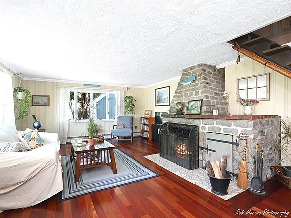 Walk to area beaches from this sun-filled, open-concept beach house. Enjoy year-round peeks of the ocean, with especially nice vistas during the off-season. The backyard footpath ascends to a platform, high above it all, with panoramic views of the water and Boston's skyline! This Nahant residence is solidly perched on a south facing hillside, well above Castle Road and does not require any flood insurance. Well maintained with lots of recent improvements, including: modern gas heating system in 2010, renovated bathroom in 2016, new architectural shingle roof in 2018 and a brand new brick front porch in July 2020. The large kitchen, living room and rear patio area are great for entertaining family & friends. The winter months remain warm and bright, thanks to large windows and the beautiful center stone fireplace. The entire 2nd floor comprises a master suite addition, built in the 1980's. Both bedrooms are ensuite.