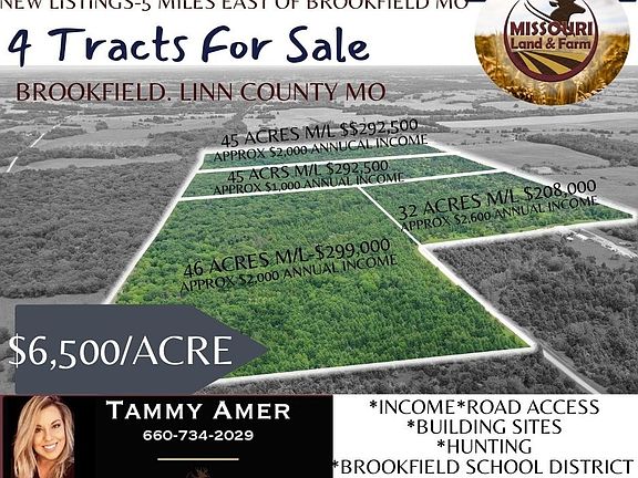 32 M/L Acre tract Available -For Sale, Linn County MO Subject to be surveyed. This 32 Acre tract brings in approx. $2,600 annually until 2027. Located just 5 miles east of Brookfield. Interested in hunting big deer, you'll notice the thick cover provided by the income producing tree program a perfect complement to the majority of mature timber. Turkey hunting in this stretch North of the Highway 36 corridor is some of the best in the area. The farm offers convenient access yet is perfectly secluded with great potential for a country building site. Brookfield R-3 school district. Other small tracts available. Priced at $6,500/acre. Call Tammy Amer @660-734-2029