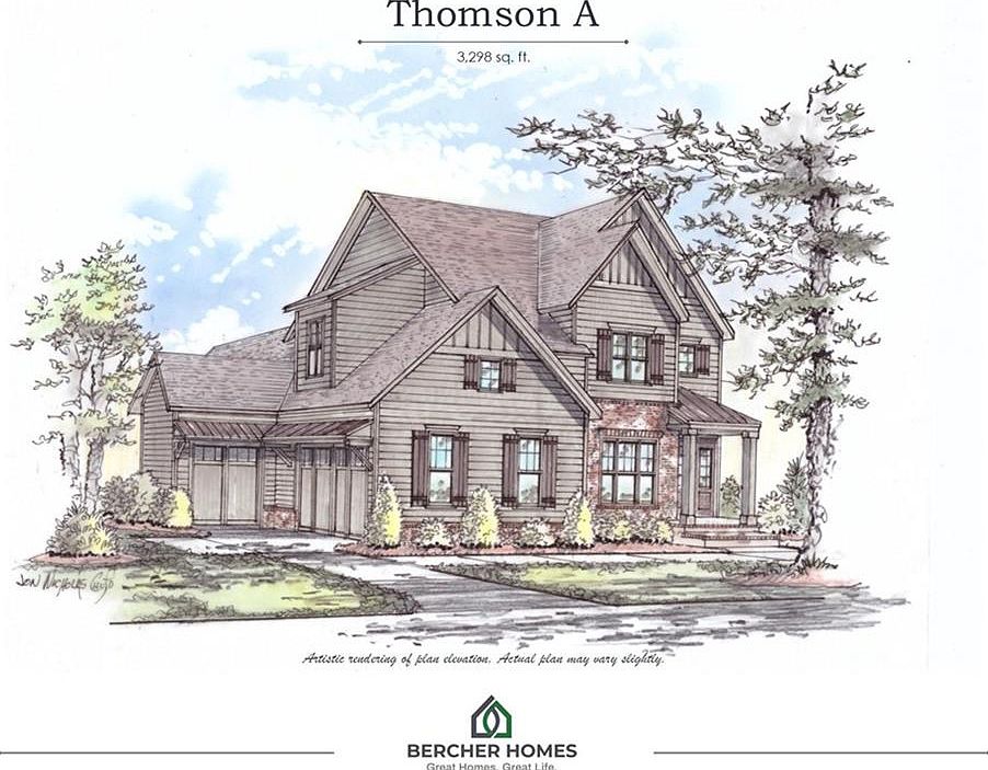 With it's light filled gathering spaces, the Thomson floorplan provides a touch of elegance to the everyday. This open floor plan features the primary bedroom plus a guest bedroom on the main level. The covered front porch opens to foyer and front guest bedroom w/ hall full bathroom. Ahead is the open concept layout w/ dining area, family room w/ wood-burning fireplace, built-ins, and lots of windows for natural light, adjacent to the generously sized kitchen. Enjoy the extensive cabinetry that features soft close doors and drawers, Bosch appliances, Quartz countertops, pendant lighting, large working island, and more. The large primary bedroom features a trey ceiling and overlooks the backyard. The spa-like primary bathroom includes a large tile shower with a glass enclosure, raised-height double vanity, freestanding tub, and a huge walk-in closet that connects to the laundry room. The rear hallway entry from the 3-car garage finds the laundry room w/ sink and mudroom lockers. Upstairs there is a large loft/flex area plus 2 large secondary bedrooms, each with a private bathroom and walk-in closet. Additional standard features include extensive hardwood flooring, 10 ft ceilings w/ 8 ft solid core doors on the main floor, irrigation system, tankless water heater, and double-hung Pella windows, 3-car garage, plus many more. In Woodford, this floorplan can be built as a slab or basement. Bercher Homes' beautiful new community located in Acworth will total 38 homes and is located near the Brookstone Golf and Country Club. Lots are all around 3/4 acre. For your peace of mind, we include with each home a Builder's Warranty, a Structural Warranty, and the installation of the in-wall Pestban system. Come and experience the Bercher Homes difference. With our design process, this can be the home of your dreams. List price here does not include buyer-specific upgrades and options. Lot premium may apply. Interested but looking for a different home setup? We have 10 unique floorplans available to build in Woodford!