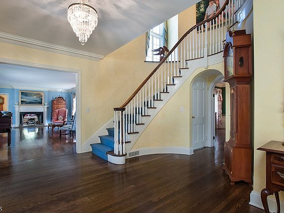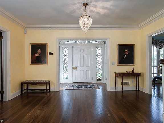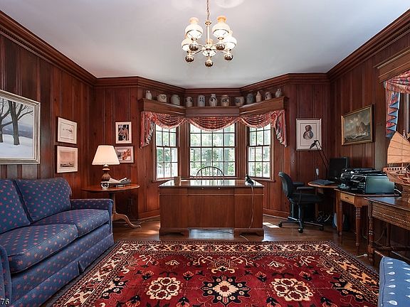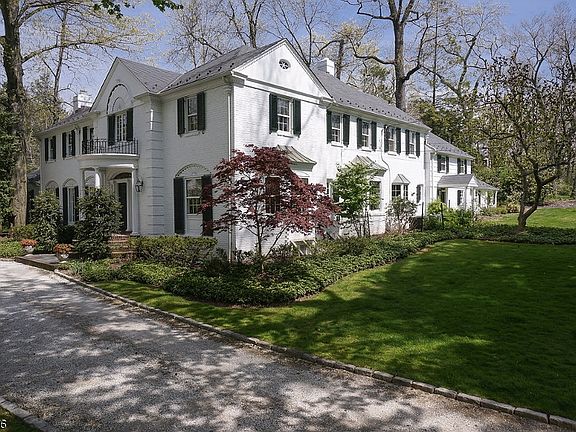 A welcoming home; one of the most iconic in all of Old Short Hills! Beautifully poised on a diagonal, with pillared portico and a circular front drive spanning two streets, this is the home that makes you smile every time you drive by it. Entering is like meeting a friend with an open heart. A reception hall with a sweeping bridal staircase sets a gracious tone for the rest of the house. An inviting living room features three sets of French doors that bring the outside in, enhanced with a focal “see-through” fireplace that connects to the sun-filled southwestern-style family room set beneath a high tray ceiling, with soaring windows, built-in bookcases and French doors that open to a brick patio accented by mature trees and plantings. The formal dining room is adorned with raised paneled wainscoting and French door which opens to a charming Juliet balcony. A handsome paneled library is clad with bookcases all around and pretty views from a focal bay window. It is a home with well proportioned rooms and well positioned windows with subdued elegant detailing. The kitchen is country-style and sun-drenched with property views from a garden window and lovely bay window in the breakfast area. There is a nearby mud room with laundry and entrances from the yard and the drive, along with door to a two-car attached garage and potting shed. Convenient back staircases to both the second floor and the lower level are an additional special feature. The second-floor master wing is set apart, light-filled with wall-to-wall carpeting over wood floors, and windows on three sides, enhanced with two custom fitted closets and a spacious updated master bath. A private guest suite, off the back staircase, is poised beneath a beamed cathedral ceiling, complete with a bath and oversized shower -- the perfect place for the pampered guest, an adored nanny or a privileged teen. Three additional bedrooms comprise an en suite bedroom with private shower over tub and bath and two others that are served by a full hall bath with tub shower. A cherry paneled study room with a large partners styled desk and custom built- ins (offering additional desk space) and custom built shelving designed to accommodate a multitude of resource material. There is plenty of leisure living to be enjoyed in the finished lower level, recreation/game room, play room and a media room with custom built-ins, along with a pathway to the outdoors and access to stone patio and grounds. A half bath, storage room and workshop/utility room complete the picture. You will feel the embrace of this home, offered for sale for the first time in a generation.