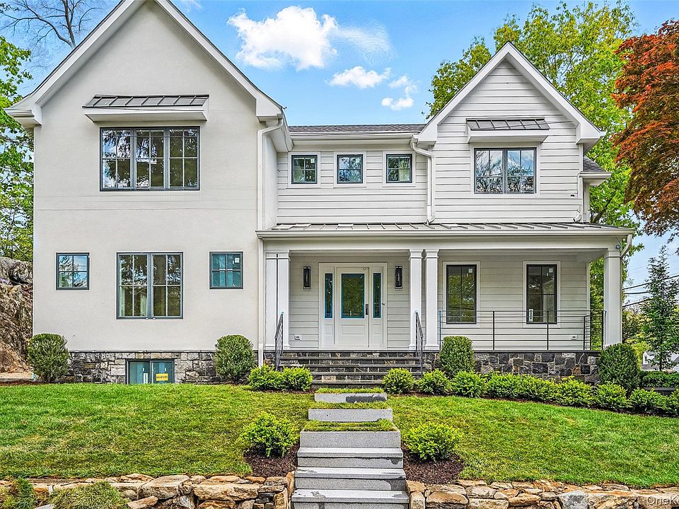 This exquisite brand-new construction blends timeless elegance with modern comfort, offering 5 spacious bedrooms and 4.5 luxurious baths across a thoughtfully designed open floor plan. Situated on a private street just a 10-minute walk to the train, the charming town of Rye, Rye Arts Center, parks, and the award-winning Midland School, this home is the perfect combination of convenience and style. At the heart of the home is a custom Bilotta chef’s kitchen, featuring an 8-foot oak island, open shelving, and a matching fireplace hearth. The gourmet setup includes a 48" Thermador range, Thermador dishwasher, 42" Sub-Zero refrigerator/freezer, and a separate wine cooler in the elegant bar area—ideal for entertaining. Beautiful quartz countertops and a quartz slab backsplash complete the space, which opens into a sun-drenched family room and flows seamlessly to the granite patio with built-in BBQ with refrigerator, all nestled among natural rock and beautiful trees. Enjoy formal entertaining in the dining room adorned with a designer chandelier, or relax in the elegant living room/office. Rich crown molding and natural hardwood floors extend throughout the home. A powder room, pantry, and walk-in entry closet complete the first level. Upstairs, the primary suite is a private retreat with two walk-in closets and a spa-like bath featuring an oversized marble shower, soaking tub, double vanity, and vaulted ceiling with custom woodwork. Two bedrooms share a Jack-and-Jill marble bath with vaulted shiplap ceilings, while a fourth bedroom includes an ensuite marble bath. The lower level offers a fifth bedroom with built-in Murphy bed, full bath, extensive storage, a mudroom with cubbies and closets, and access to the 1-car garage with additional 2-car driveway parking. This impeccable home delivers superior craftsmanship, high-end finishes, natural stone and an unbeatable location—ready for you to move in and enjoy.