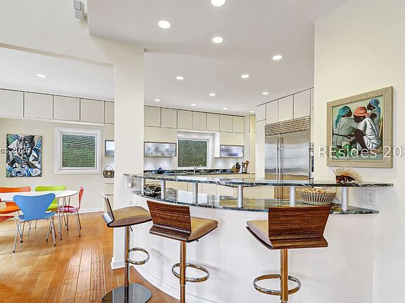 This sophisticated Marsh Island turn-key home offers a perfect floor plan and a gorgeous stunning marsh-wrapped view of the free-form pool with a large Stone Works designed surround. The numerous first-class updates in this home, its meticulous care, and only part-time occupancy by the owners add to its endless appeal. Enter into an atrium that opens to the great room and dining area with soaring ceiling, and the kitchen and breakfast area. This magazine-worthy kitchen offers extensive Poggen Pohl cabinets, SubZero refrigerator, Wolf Microwave and cook top, double ovens, Madagascar marble counters, and a laundry/pantry room with wine racks and a wine refrigerator. Also located on the first floor are a separate office and the primary suite. Over the garage is a large bonus room. Off the foyer soars a modern staircase and balcony with stainless handrails and balusters leading to the 3 guest rooms. There is a 220 volt EV charger in the garage. Enjoy the exclusive and coveted Marsh Island residential neighborhood, with close access to Sea Pines Country Club and all that Sea Pines offers.