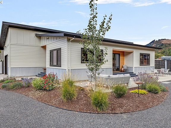 This one-owner home is meticulously maintained and situated on a spacious half-acre lot, providing plenty of outdoor space. It features newly landscaped grounds with drought-resistant plants to ensure low maintenance and sustainability. The sleek lines and modern design embody NW's contemporary styling, while the fresh exterior paint gives the home a clean and attractive look. Equipped with solar panels, this home features an impressive door blower test score of 2.6 ACH, indicating excellent air tightness and energy efficiency. This energy-efficient home helps reduce utility costs and minimizes your carbon footprint. Designed to maximize energy savings, it perfectly blends modern living with sustainability. Don't miss the chance to own this stunning property! 12 minutes from the Hood River Bridge.