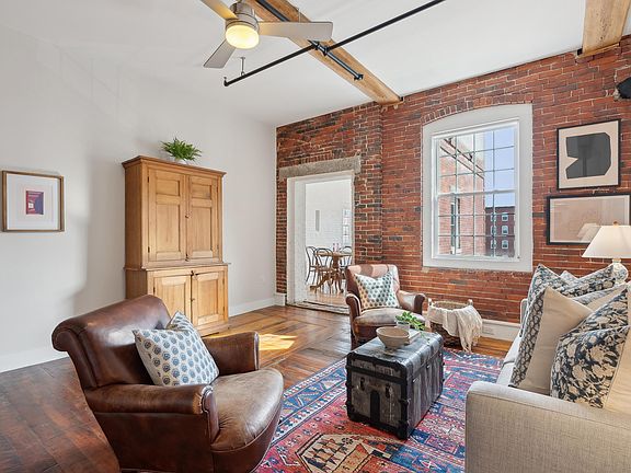This two bedroom, two bathroom condo features a sun filled den that leads to your private balcony. The condo exudes historic charm with its high ceilings, exposed brick and beams, antique maple hardwood floors, and over sized windows. Modern conveniences include an upgraded kitchen with stainless steel appliances, kitchen island and granite counter tops, heat pumps for efficient heating and cooling, and an in-unit washer/dryer hookup. The popular layout features a bedroom on each side of the living room, with a primary bedroom offering an en suite bathroom and a walk-in closet. The generous bedroom sizes easily accommodate king-sized beds and your personal touches. East-facing windows flood the brick-accented living room with morning light, creating a delightful, sunlit atmosphere.