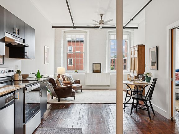Discover this charming, light-filled one-bedroom condo in Biddeford, Maine, located in the vibrant Pepperell Mill Campus, an iconic riverside mill complex transformed for modern living. This beautifully designed unit combines historic character with modern convenience, featuring high ceilings, painted brick and beams, antique maple hardwood floors, and oversized windows that bathe the space in natural light.