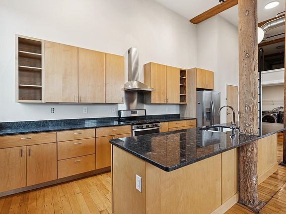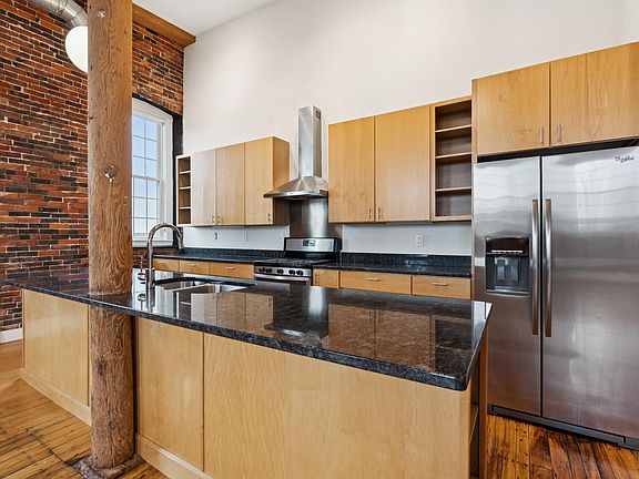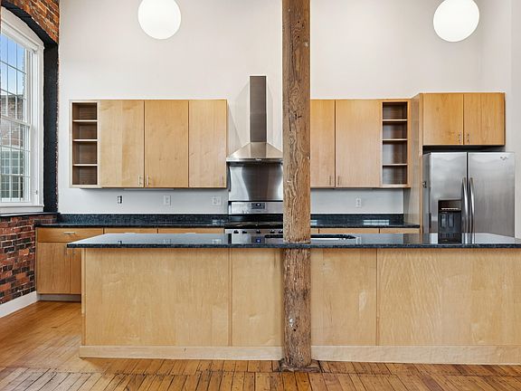 This rare three bedroom, two bathroom corner condo with water views from every single window is arguably the best unit at the Pepperell Mill Condos. It is one of only 3 three bedroom condos in the building. The condo exudes historic charm with its sky-high ceilings, exposed brick and beams, antique maple hardwood floors, and oversized windows. Modern conveniences include an upgraded kitchen with stainless steel appliances and granite countertops, central ducted heating and cooling, and an in-unit pantry/laundry room. The generous bedroom sizes easily accommodate king-sized beds and your personal decorating flair. North-east facing windows flood the brick-accented living room with morning light, creating a delightful, sunlit atmosphere.