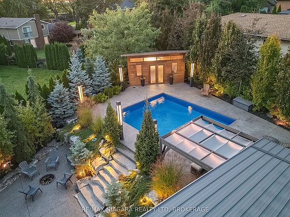 Estate style lot surrounded by mature trees in the gorgeous Bevan Heights location featuring 3 bedrooms with a potential 4th, 5 bathrooms, a Boldt saltwater heated pool, outdoor poolhouse with bathroom, metal roof, heated garage, 200amp service, Generac generator, and EV charger. This exceptional estatae featuring 3,000 sq/ft of finished living space is offering refined living with the charm and tranquility of a Muskoka retreat. Surrounded by mature trees and lush, professionally landscaped grounds, the property is a true blend of elegance, privacy, and natural beauty. Inside, the open-concept layout features vaulted ceilings with exposed beams, engineered hardwood, and heated kitchen tiles. The gourmet kitchen boasts Kraft Maid cabinetry, an oversized Caesarstone quartz island, premium appliances, and skylights that flood the space with natural light. The living room is anchored by a floor-to-ceiling stone gas fireplace, while custom built-ins provide extra storage or a dedicated office space. The dining room is elevated with a Venetian feature wall and an electric fireplace.Upstairs, the primary suite has French doors to a covered porch overlooking the backyard, a spa-like 4-piece ensuite with heated towel racks, and a walk-in closet. The second bedroom offers its own ensuite and a private covered balcony with garden views.The lower level includes a large family room witha gas fireplace, a third bedroom with a 3-piece bath, and an office with a kitchen rough-in, ideal for an in-law suite. Outside, enjoy the in-ground saltwater pool, cedar cabana with 2-piece bath and outdoor shower, pergola, hot tub, and fire pit. The smart system controls lighting and music, while the irrigation system keeps gardens lush. The heated garage offers parking plus space for a workshop or storage. This home blends modern luxury, cottage charm, and privacy, an extraordinary place to call home.