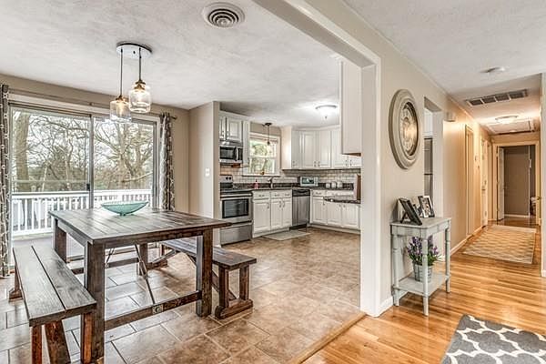 House Beautiful! Welcome to this meticulous West Peabody split-entry home. An attractive brick walkway entrance leads to the front door where this open, warm and inviting floor plan will instantly welcome you. There is a newer granite eat-in kitchen with slider to the deck which allows for a sun-drenched room! There are hardwood floors throughout most of the first level and you will love the versatile family room/game room with fireplace in the lower level for additional relaxed living space. Both baths have been tastefully updated. Extra features include a Harmon Pellet stove in the living room, central air, a security system, and the roof was done in 2011. The deck overlooks a fenced in yard with a fire pit for social gatherings! Everything has been done, just move right in and start enjoying your new home!