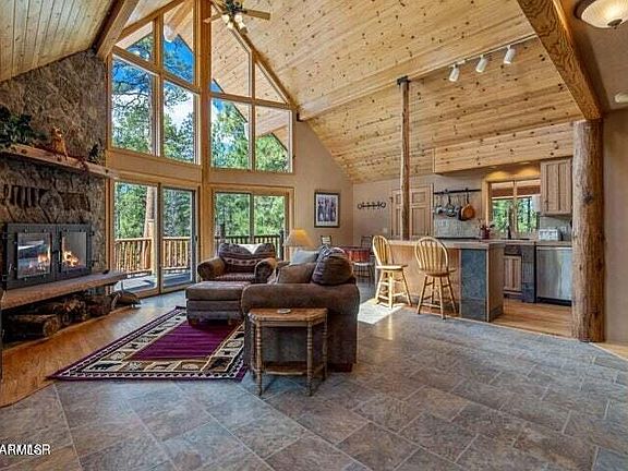 The great room features soaring, ceiling-height windows that flood the space with natural light and offer stunning views of the surrounding trees.