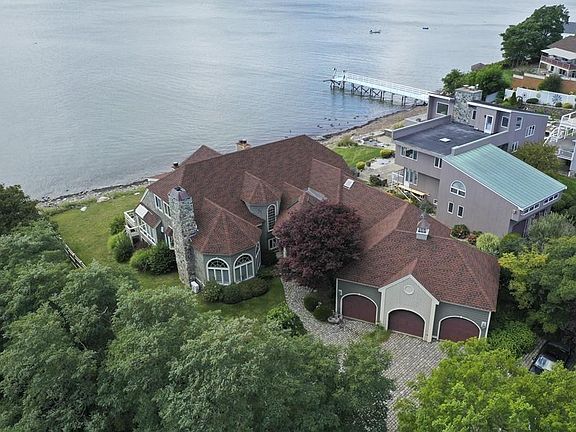 Space, water and light...all in this direct oceanfront contemporary with southward water views from all levels and a private beach to moor your boat.With over 8,000 sq ft, and an open floor plan,you can take in sunsets from floor to ceiling windows and doors.Enter into exquisite detailing including limestone,slate, and inlaid mosaic hardwood floors,while under soaring ceilings in the living room cathedral up to 27 feet high.Multiple decks, recessed lighting,Venetian plaster and 5 fireplaces.Main kitchen boasts 6 burner Viking Stove,double copper sinks,wine cooler,fireplace and deck access.Master has/double walk-in closets,jacuzzi, and dressing room. A home for entertaining with 24 rooms including two kitchens,two living/dining rooms, and game room,library,wine room, cedar room, in house gym and movie theater.6 car garage with lifts.The sheer square footage of each level could be reconfigured in many ways;add bedrooms,or in law suites.5 beds 6 baths.6 zones heat.Luxury abounds.