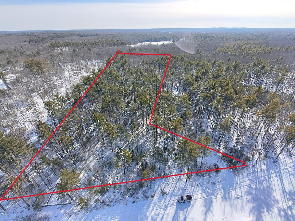 The photo with the red markings shows an estimated boundary line. See the survey for more detail. The property is well marked with ribbons showing the boundary.