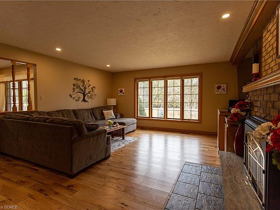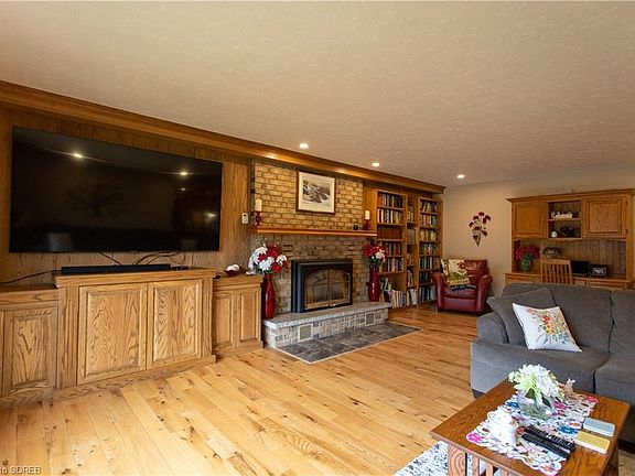 They don't make them like this anymore! Come see this beautiful, well built bungalow on a quiet street in a stress free town. There is a full kitchen on both upper and bottom floors with newer appliances. Many upgrades including updated quartz countertops in the upstairs kitchen and bathrooms. New flooring in living room (red oak hardwood) and LVT on most of the main floor. Large living room with gas fireplace, and feature wall with oak built-ins. New pot lights in kitchen, dining, and living room. LED lighting throughout. The large backyard is professionally landscaped for season changes and many species of Carolinian trees, apple and peach trees. You can either entertain on the back patio on the interlocking bricks cooking on the premium built-in Crown Verity BBQ, or relax on the spacious front porch watching the world go by. Newer sprinkler system covers back and front with three outdoor taps. Both backyards sheds are wired. Feature wall in basement rec room has a wood-burning brick fireplace. There is an attached 2 car garage that fits the current owner's full-sized truck with ease. Call Listing Agent for more information.