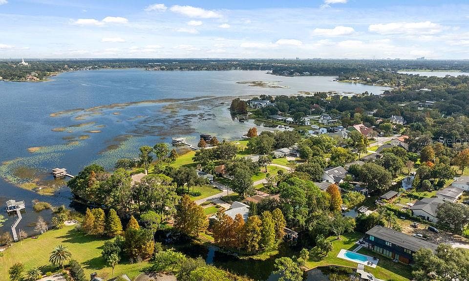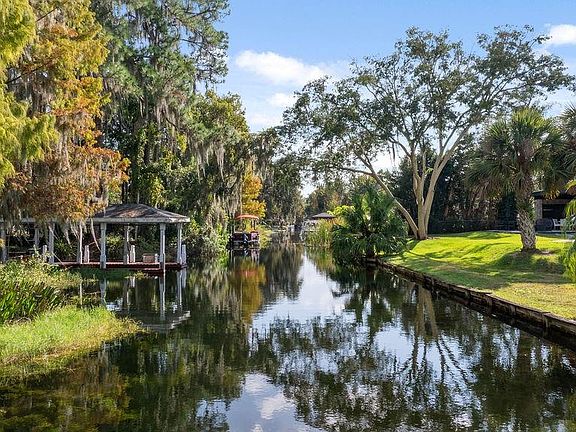 CANAL FRONTAGE ON 2 SIDES! Extremely RARE in the TOWN OF WINDERMERE, a single story 3/2 in a CUL-DE-SAC, on a PAVED STREET with a DOCK and CANALS ON 2 SIDES giving DIRECT ACCESS to LAKE DOWN AND WASEON BAY and the ENTIRE BUTLER CHAIN BEYOND. This lovingly maintained home is move-in ready, ready for your personal touches, or the ideal lot for your waterfront dream home. Extensive landscaping with abundant flowering plants and a covered front porch provide a warm welcome to this spacious ranch home. A foyer divides the kitchen and living spaces from the bedroom wing. The kitchen features solid surface countertops, wood cabinets and a breakfast nook with views of Lake Down. A large formal dining room and living room offer ample space for hosting holidays and entertaining family and friends. An absolutely enormous family room with wood plantation shutters is anchored by a beautiful wood burning fireplace and views of the canals. The spacious bedrooms feature vaulted ceilings and California closet organizers. The primary suite has an en-suite bathroom and sliding doors to a large, covered patio in the rear. The primary bath and hall bath have been beautifully updated. The large rear and side yards are also heavily landscaped with wood paths, mature cypress trees and unparalleled views of the canals. There is a COVERED DOCK in the rear. This is a NATURAL GAS home with hookups for the GRILL, DRYER and TANKLESS WATER HEATER. One of the 2 car garage bays currently houses a SAUNA. ROOF REPLACED in 2019, A/C in 2016. This is what Windermere living is all about - a large cul-de-sac waterfront lot on the Butler Chain of Lakes and a short distance to the shops and events in downtown Windermere.