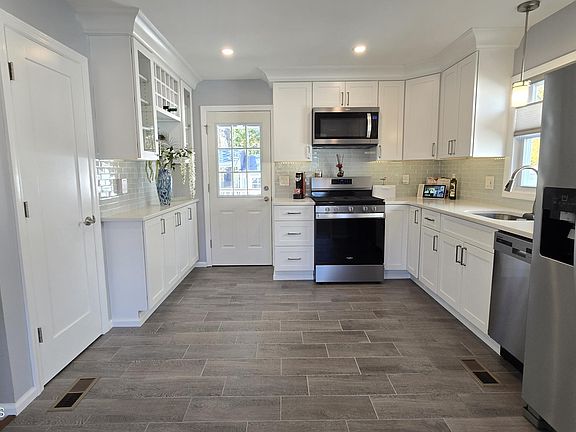 Modern eat-in kitchenSpacious backyardStainless steel appliancesWhite shaker cabinetsCeramic tile floorStone countertops