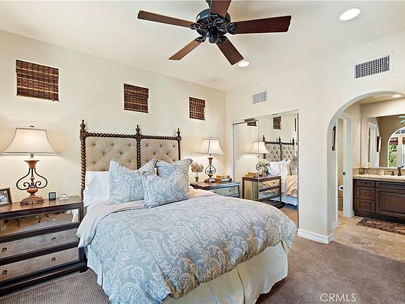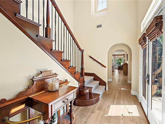 Rare Find approx. 11,000 lot in Exclusive Gated Covenant Hills neighborhood of Ladera Ranch. Nestled in the Las Piedras Collection, 2 PORTALON COURT sits at the end of a quiet cul de sac with a private oversized lot. This unique floor plan offers a primary down, 4 bedrooms, 4.5 bathrooms, 3rd story bonus room or private office and a separate entrance Casita complete with a full bath. This home boasts Provenza Wood Flooring throughout the first level, ample storage and a walk-in primary closet with custom built-ins. Primary bath has a large soaking tub and dual sinks. The open kitchen has been remodeled with "Taj Mahal" Quartzite countertops, large farmer white, porcelain sink and designer lighting. Just off the kitchen sits a charming 150 bottle wine room. The spacious family room has a raised hearth fireplace, updated mantel, custom built ins, walk in pantry, and ample lighting with overhead sky lights. The modern Italian formal Dining Room looks out to the courtyard and garden, complete with built in BBQ. Staircase, second and third levels have brand new Anderson Tuftex Berber carpet. Secondary rooms have all their own full baths, third level loft has many options for flex room. The Casita has a separate private entry with full bath. This substantial sized lot backs to an open park offering privacy & ambience. This special lush green yard offers two water features, one large, covered loggia, one large courtyard accessible from two sets of French doors, and multiple fruit trees. The 3rd car garage has an abundance of custom storage and counter space from California Closets. Don't miss this highly sought-after opportunity. Lot can accommodate pool or a pickleball court.