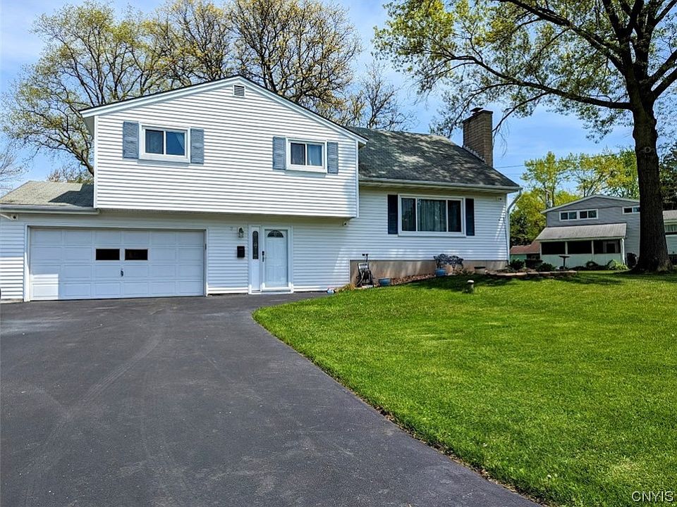 Delayed showings until Saturday, 6/3 @ 12:00pm. Beautiful Bayberry split level has lots of room - inside & out! Step inside the foyer entry, or come in from the garage, to a large den with sliders to the big, fully fenced yard! Genuine hardwood floors and a warm and welcoming gas fireplace make the livingroom/dining room combo a great space to relax or entertain. Plenty of windows and tons of natural light & the well equipped kitchen has lots of cabinet space. A few stairs up to three good sized bedrooms with hardwood floors, generous closets and a full bath. A few more steps up to the large primary suite with double closets & private bath. The basement features a supplemental wall furnace, laundry hook-up, storage & you'll notice the steel I beam construction! Outside, you'll find a new driveway, 2 car attached garage & a large, fully fenced yard! Other updates include vinyl windows and shed. Great location is just minutes to all conveniences and highways. Liverpool Central schools. If you have been looking for a well built home, in a great location, with plenty of space - look no further! Taxes are shown without the basic STAR exemption.