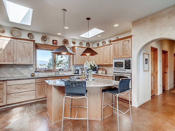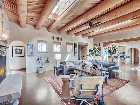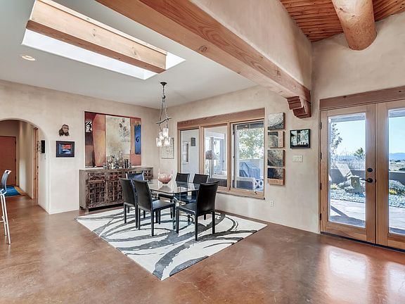 This is a stunner in Eldorado. Starting with the location - when you walk in the front door you look out for miles to a beautiful view of the surrounding terrain and as far as the Sandias Situated at the end of the subdivision this home feels very rural. The high level quality of this one owner home is evident and the owners have cherished it. In addition to the 3 bedrooms, 2 of which are separated from the master down a hall, there is a large light filled extra room that is currently being used as a artist's studio but could be 4th bedroom/ den/ family room/ in home office for the new owners with an outside entrance. Poured colored concrete floors create warmth and welcome, vigas in the living room are accompanied but a lovely latilla treatment and the open concept living- dining - kitchen will make you feel right at home. There are portals off of all 4 sides of this home, all with their own wonderful feel. The Western portal has views of the Jemez and there are even views of the Sangres out the kitchen window over the sink. The floor plan is terrifically livable and the 3 car garage is frosting on the cake!