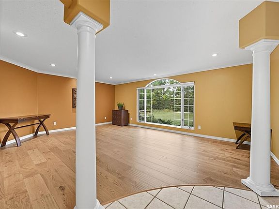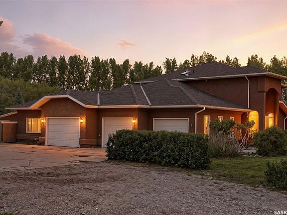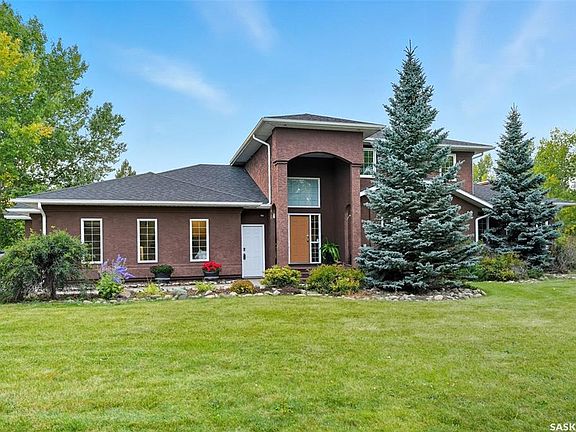 Highly desirable CEDAR VILLA ESTATES!!! Only ONE km from city limits! Enjoy the serenity of country living with city convenience such as treated SK water and high speed fiber internet!! Well maintained 2 story split offers the perfect blend of luxury and tranquility situated on well treed 2.81 acres. This home is designed for function, style and entertaining. Gourmet kitchen with maple cabinets, granite counter tops including the island, tiled back splash + a pantry. Open into the Livingroom which offers cathedral ceilings and gas fireplace. Garden doors to multi-level deck. Separate formal dining room is great for hosting functions. Main floor laundry. Primary bedroom is on the main floor as well with 4 pc ensuite and walk-in closet. 2nd floor has 3 more spacious bedrooms and another 4pc bathroom. Plenty more space in the WALKOUT basement! Complete with a family room with built-in feature wall including a gas fireplace. Garden doors from the sunroom to the amazing yard. There is also a games area and 2 more "flex" rooms for a gym or your favorite hobby with it's own 3pc bath. Upgrades included newer engineered hardwood flooring, furnace, water heater and A/C 4 years old. Attached oversized 3 car garage with attached heated work shop. PLUS a detached 23'x13'7" garage. Plenty of room for the acreage toys! Perfect entertaining yard set up with in ground POOL and wrap around multi level deck complete with gazebo. The inviting pond adds to the aesthetic features and serenity of surrounding nature. Glorious heavily treed lot has plenty of space for out door activities. Inviting stone pathway leads to a private firepit area. There is a deep well for the yard watering along with underground sprinklers. Experience the perfect balance of luxury living and country charm in this Cedar Villa acreage!!