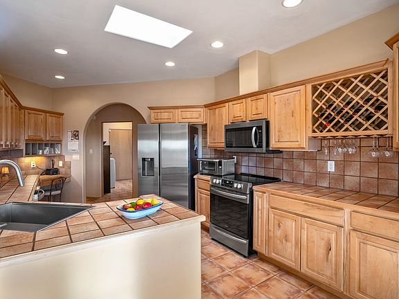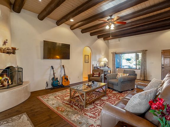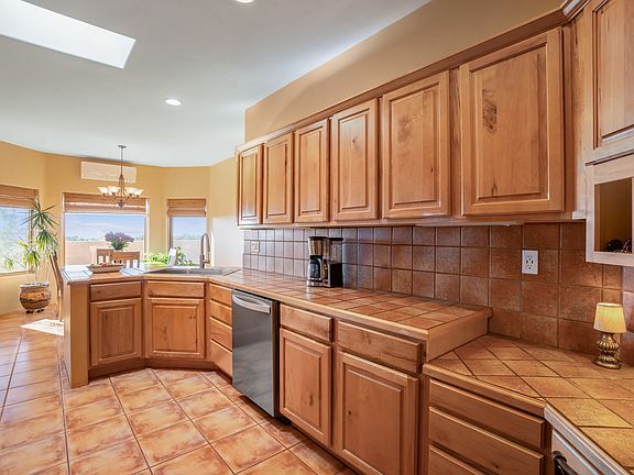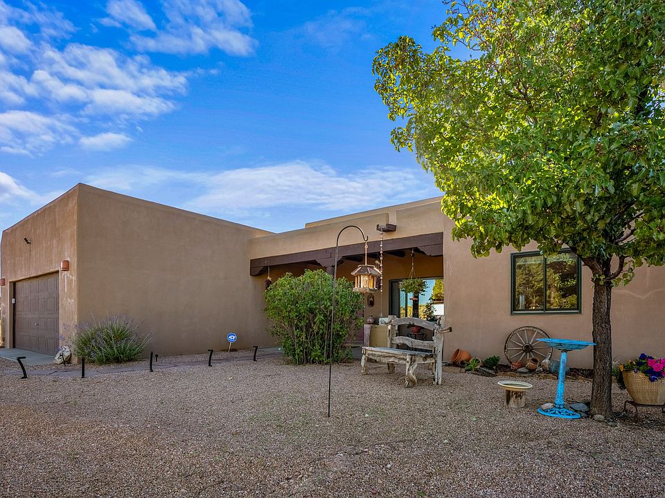 Eldorado Gem! Perfectly situated to take advantage of the commanding views. this single-level, 3 bedroom 2 full bath home offers a split floor plan: skylights, a spacious living area with high ceilings, radiant heat throughout, there's also 6 total mini-splits for heating/cooling, a kiva fireplace and laminate wood flooring. The sun-filled kitchen provides ample cabinets for storage and a gorgeous view from the breakfast nook. The Owner's suite has vigas and T&G ceilings with a generous walk-in closet. The en-suite bathroom features double sinks, a garden tub, a private water closet, and a spacious tiled walk-in shower. The hallway offers a generous sized niche for artwork that leads to the spacious utility room with sink, upper cabinets & plenty of storage. The garage is finished, over sized and deep. You will love the bonus 169 sq ft detached studio complete with windows, mini split and electricity with room for overhead storage. Enjoy the NM skies with mountain views and sunsets from the rear covered portal. The rear courtyard is a gardener's dream complete with rain barrels for water harvesting!