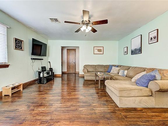 Remarkable spacious home on over an acre! This 4-bedroom home has a very nice open floorplan with large living area with wood laminate flooring, ceiling fan and large window for lots of natural lighting. Kitchen has great cabinet, countertop space and eating area. Stainless steel appliances which include stove, oven, dishwasher and refrigerator. Master Suite has walk in closet, ceiling fan and a separate bathroom with large vanity for tons of space. Secondary bedrooms have ceiling fans and walk in closets. 2 car attached garage. Storm shelter and outbuilding great for a chicken coop.