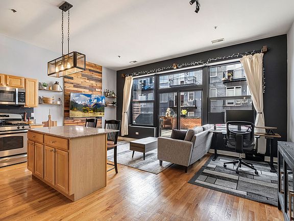 Welcome to this stunning 1 bed, 1 bath loft-style condo in a boutique elevator building, offering the perfect mix of urban living and modern comfort. Soaring ceilings and a striking wood feature wall create a dramatic and inviting living space. The open-concept floor plan features hardwood floors and a wall of windows opening to your massive 350 sq. ft. private deck-ideal for entertaining or relaxing. The kitchen impresses with granite countertops, a large island with breakfast bar, and stainless steel appliances. The spacious bedroom is partially enclosed and includes a wall of closets and the updated bath offers a dual vanity and beautifully tiled walk-in shower. Enjoy in-unit laundry and a deeded heated garage space included in the price. Perfectly located just blocks from the United Center and with a bus stop right outside, this home sits in a lively, growing neighborhood close to dining, shopping, and city attractions.