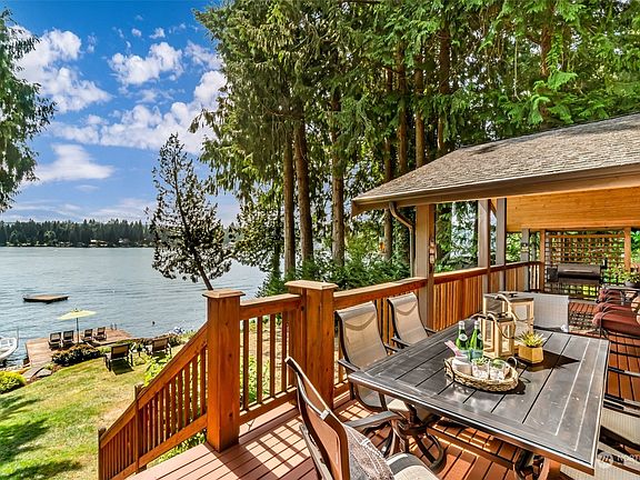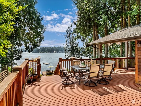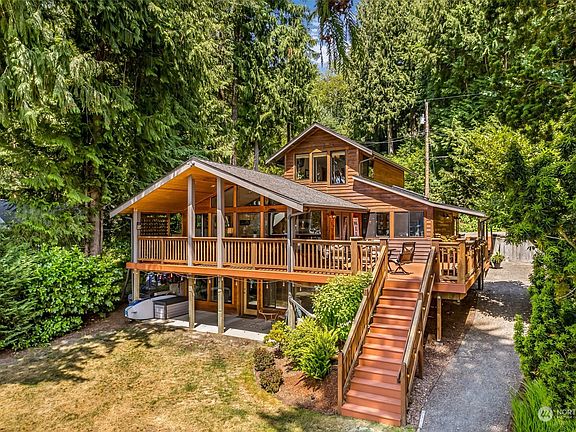 The ultimate luxury lakefront lifestyle on Lake Roesiger. This fully renovated chalet-style home boasts breathtaking western views through soaring windows, blending nature + architecture. Enjoy 60ft of private low bank waterfront with dock + deep water boat slip, it's a haven for water+sports enthusiasts. The interior showcases exceptional craftsmanship with post and beam construction, hickory cabinets, quartz counters and heated slate floors. Main floor features inviting kitchen/living/dining, guestroom, den and full bath. The top floor suite offers panoramic lake views and spa-inspired bath. Lower level family room, additional den, bath and storage. Electric car charger. A/C. Just 15 min to Snohomish offering seclusion and accessibility.