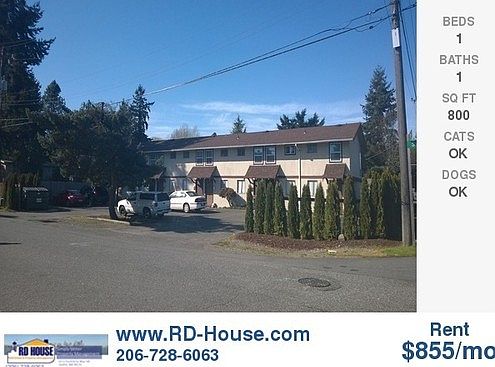 Truely fun place to LiveCool Loft close to airport and Downtown Seattle/ On Bus Linevery cool place Total cost to move in NEW Built in Mico Wavelot space parking patioRent $855.00 X$855.00 x$855.00 Move you in-$ 2565.00 ** Notes** No washer or dyer/or dishwasher Newer Range selfcleaning/and ref- over the counter M/Woffstreet parking Galley kitchen dinning and Living downstairs with patio for plant and lots of lightupstair one full size bath and bedroom area that will fit king Bedroomsummary** rent 855.00 Sec 855.00 Move you in-2565.00 utilities included (not Cable)small pets under 20lbs $250.00 Dogs $200 Cats6 mile from downtown Seattle-take Hwy 99 to 509 turn right @ ex 128th heading west @ 1st ave S turn RTwhen heading N on 1 st ave s look for 119th st turn left into drivewayCall RD House Real Estate & Property Management INC206-728-6063www.rd-house.comTo view our other properties,Please Call US! or visit our web sitewww.rd-house.com 206-728-6063Thank you for your Business.
