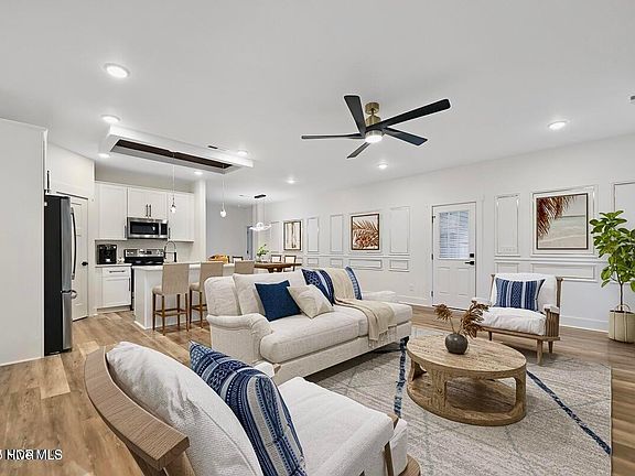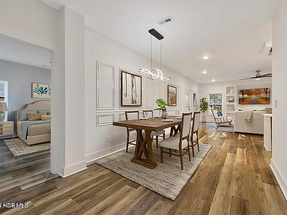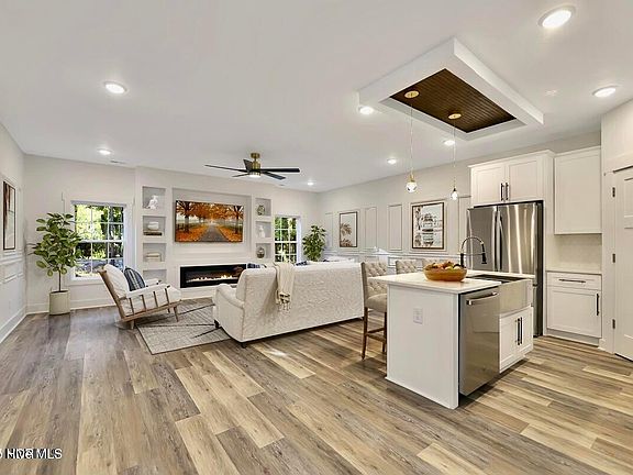 Discover a home that flawlessly blends modern sophistication with charming farmhouse elements, showcasing unparalleled craftsmanship. This stunning residence features elegant trimmed windows and doors, exquisite picture frame molding, soaring 9-foot ceilings, beadboard ceiling accents, and luxurious plank flooring. Step inside to an inviting entryway and a practical drop zone, enhanced by elegant wood shelving and a stylish brick wall accent. The living and dining areas are thoughtfully designed to create a warm and welcoming space. Chic built-ins frame the fireplace, elevating the ambiance throughout the room, with decorative lighting that creates an inviting atmosphere. The gourmet kitchen is a chef's dream, complete with a spacious deep pantry featuring wood shelving, shaker cabinetry with soft-close options, a functional island, quartz countertops, a stylish tile backsplash, and premium stainless steel appliances. Your master suite is a true retreat, boasting two generous walk-in closets with wood shelving. The master bath dazzles with a double vanity featuring vessel sinks and a luxurious zero-entry tile shower. The thoughtfully designed guest rooms and guest bath ensure that visitors feel right at home. Unwind on the back patio, a serene space designed for both privacy and an open concept lifestyle. This home also offers a finished two-car garage and ample attic storage space. The curb appeal is enhanced by a partial brick front, chic board and batten siding, shutters, exterior lighting, and functional gutters - all standard features that exceed expectations. Enjoy outstanding community amenities, including a sparkling pool, tennis courts, and a vibrant clubhouse, all supported by low association dues. Located in Calabash, the Seafood Capital of the World, you're just minutes from beautiful Sunset Beach, boat ramps, golf courses, and a variety of seafood restaurants and entertainment. Photos are of a similar home already built.