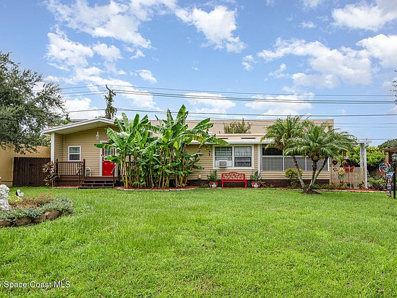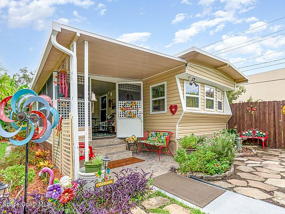 Charming & Meticulously Maintained! This 2BD/1BA home sits on a spacious 0.25-acre corner lot with NO HOA—YOU OWN THE LAND! Built in 1973 (pre-HUD, cash only), the property features a one-car carport, multiple workshop-worthy sheds, and a privately fenced yard with three gated entries. Inside, pride of ownership shines with lots of natural light, tile flooring, updated windows & stunning granite countertops in the kitchen & bath, complemented by custom cabinetry & built-ins. The bathroom is a ''WOW'' with an oversized walk-in tiled shower & generous counter space, while a custom office w/ built-ins creates the perfect workspace to inspire creativity. The private backyard is enhanced by a solid commercial concrete wall along 2 sides plus chain-link separation from the neighboring lot. Conveniently located near I-95, beaches, shopping & dining. Move-in ready & full of upgrades—this one is a MUST SEE!