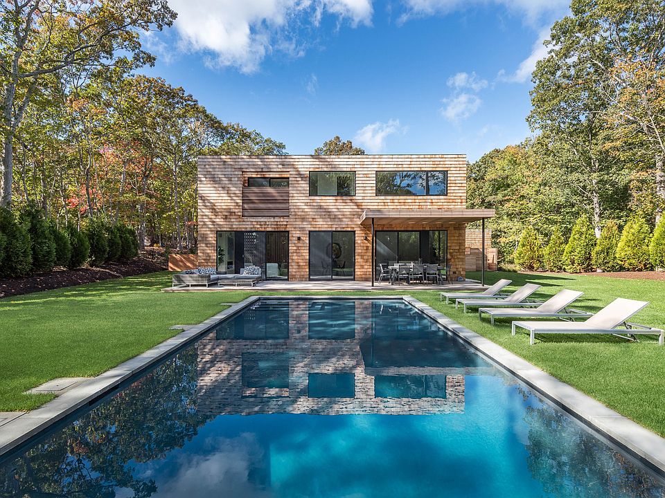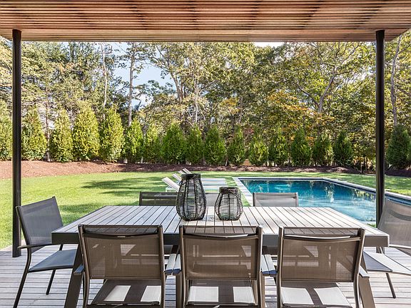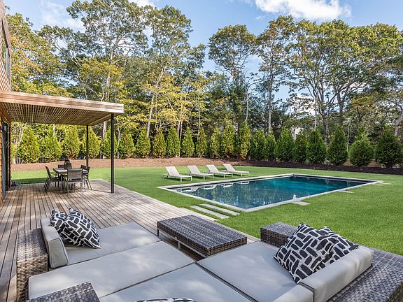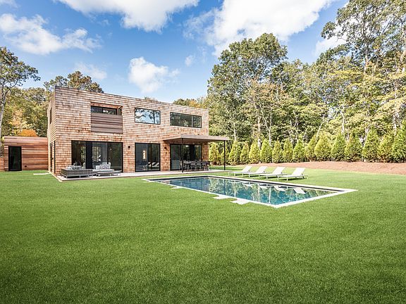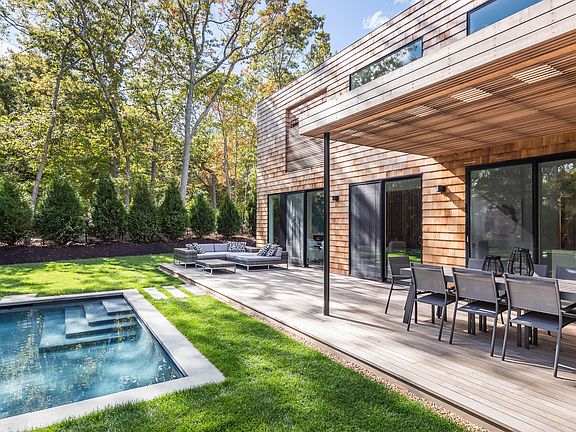 Experience the ultimate in sustainable luxury in this brand new 4000 +/- sq. ft. modern residence. Conceptualized by the highly acclaimed design/build firm Modern NetZero, who continues to set the standard for sustainable and green building in the Hamptons. This cutting edge home is a seamless blend of sleek architecture, warm interiors, modern finishes and conscious living. The crushed stone driveway leads you gracefully up to the contemporary facade composed of glass, cedar siding, and mahogany rainscreen. The entry is highlighted by a custom floating steel staircase welcoming you into the space. The open floor plan establishes an immediate connection between the living space and the outdoors, highlighted by the sliding glass doors and a southeastern orientation taking full advantage of the sun's rays. The living room with 9' ceilings and sleek modern gas fireplace connects to a generous dining area which is ideal for a night of entertaining your closest friends or a quiet dinner for two. The state-of-the-art kitchen features custom cabinetry, low maintenance Silestone counters, breakfast counter, appliances by Liebherr, Bertazzoni and Bosch. A powder room is conveniently located off the living space. The main level is complete with a junior primary suite which doubles as a den with an en-suite bath. A mahogany porch with both covered and open spaces provides plenty of room for al fresco dining and lounging, overlooking the expansive backyard with heated gunite pool and sprawling lawn. The second floor showcases the primary suite, with its spacious walk-in closet and spa-like bathroom with oversized shower, soaking tub, double vanities, and private outdoor shower and deck. Two large en-suite bedrooms finish off the second level. The lower level has 9' ceilings and two additional bedrooms with a full bathroom, as well as a large media room, an extra area which can be used as a gym or office, and a separate laundry room. A 32x16 dark bottom gunite pool surrounded by bluestone sits in the middle of the expansive and very private back yard. A detached 1-car garage rounds out the property. This modern masterpiece is sited on +/- 1 acre, which expertly optimizes the southeastern exposure and offers total quiet and seclusion. Located in the sought-after Landfall Community, seconds away from the private community beach right on Gardners bay, ideal for sunbathing, swimming, and water sports. Just a short drive to East Hampton, Amagansett and Sag Harbor villages, allowing you access to world-class bay/ocean beaches and amenities. The cutting-edge certified Net Zero design employs geothermal heat, solar energy, efficient geothermal mechanical and fresh air systems and passive solar radically reducing your operating costs without any sacrifice in comfort - saving approximately $15-$20k/year in operating costs. Combine this with the estimated $30k savings in year 1 federal tax credits and the 5-year savings becomes more than $130k. The energy you create is equal to the energy you consume. This home is MNZ's 15th build in the area, many of which have set record-breaking prices in their respective locations. The only evidence of your time spent at this one-of-a-kind home will be the wonderful memories you create. Approved by Mother Nature.