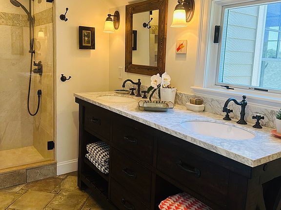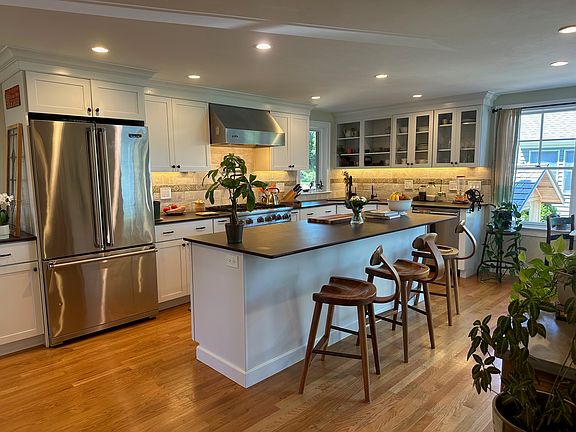 Gorgeous water-view furnished home with pristine views and easy access to the Redline Alewife T stop as well as buses to Harvard and Alewife, shops, and restaurants. It is easily accessible to Route 2 as well. The home features 4 bedrooms, 2 1/2 baths, beautifully renovated in 2018 with 2 heating systems, central ac, Viking appliances, and outdoor sauna with lovely outdoor patio with tables, chairs, couches. There is plenty of on and off street parking. Chef's kitchen has slider to deck and patio. Living room and office-like space also have sliders opening to deck and patio. Dining room with built in cabinets and 1/2 bath on main floor. Upstairs has 3 bedrooms and full bath and washer and dryer. Basement level has another living area with television, full bath, partial kitchen with washer and dryer, and another bedroom with a pond view. House is 2 doors from Pond access for paddling or canoeing and such.