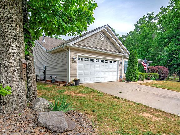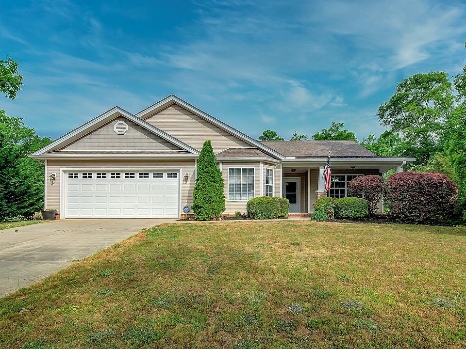 Charming 3 bed 2 bath home on almost an acre of land with a rocking chair front porch. Kitchen is fully equipped with a smooth top stove/oven, built-in microwave, dishwasher, refrigerator, and breakfast bar seating. The dining room features a bay window with wonderful natural light. Generously sized great room with vaulted ceiling, fan, and gas fireplace. Step out onto the oversized patio and take in the private and spacious yard, equipped with an Invisible Fence covering the front and backyard! Master bedroom has a trey ceiling with a fan and walk-in closet. The master bath has a double vanity, garden tub and stand up shower. There are two additional bedrooms with ceiling fans and another full bathroom. All bedrooms have new carpet! Write your offer today!