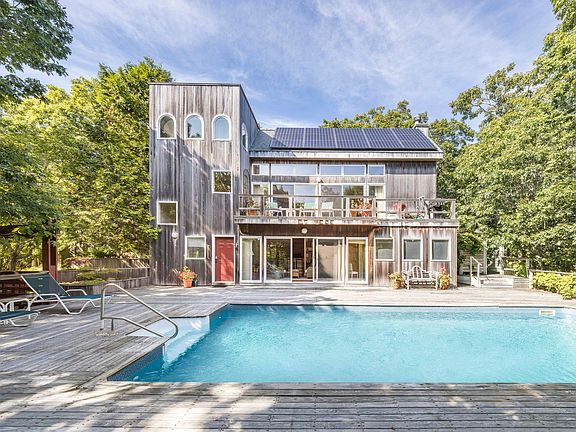 This custom Montauk offering was carefully sited at the pinnacle elevation on this wooded shy .91-acre parcel oriented to enjoy southern exposure and horizon ocean views. Encompassing 2104 SF as a multi-level home offering a level for everyone to immerse themselves in. A cathedral foyer entry leads to a lounge with a wet bar, 3 guest bedrooms, 2 baths, and a generous mud room with access to the 2-car garage. At this level the sliding glass doors open directly to the pool and its surrounding deck. The second floor houses a generous, vaulted living space focused on a stone-surround fireplace and is lined with glass sliders which drench theroom with sunlight. There are hardwood exposed beams that accent the space. The floors are maple. The galley kitchen is efficient and was renovated by a local craftsman to expand on open chefs cooking. The primary suite is on this level and is designed with double closets and an en-suite bathroom along with it own private 527 SF deck. The 3rd level offers a large private office featuring a Juliet balcony and has access to the uppermost rooftop, ocean-viewing deck. All floors are serviced by custom-installed 4 stop elevator starting from the garage level. Amenities include rectangular 18X36 vinyl pool, expansive 1100 SF of pool decking, private outdoor shower, oak/maple floors and solid, long grain fir doors. There's a private Zen-like garden that leads around the property with the ocean beach just moments away.