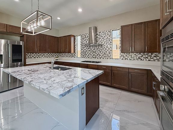 Quartz waterfall countertops, professional stainless steel appliances, walk-in pantry.