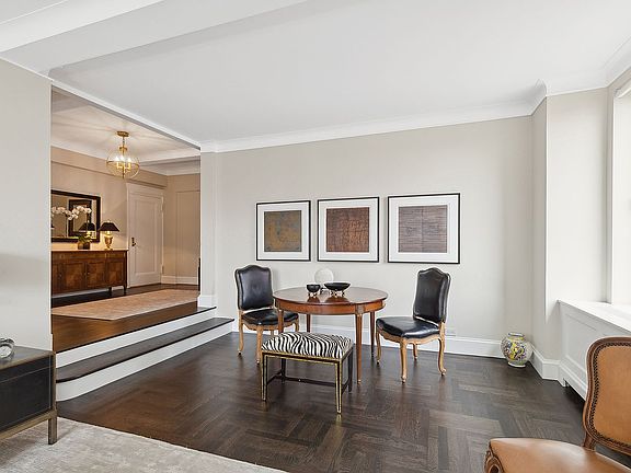 Just past the foyer is the large light filled sunken living room with lovely views of the East River, Queensborough Bridge and Roosevelt Island. There is also a working wood-burning fire place and dedicated dining area.