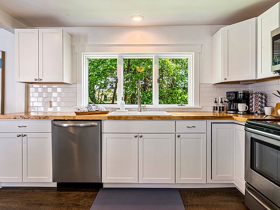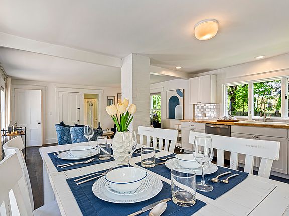 Just off the living room, the well-stocked kitchen has everything you need to prepare a delicious meal. Start your morning with a freshly brewed cup from the fully stocked coffee bar. The adjacent dining area features a table with seating for four, making it an ideal space to share meals and laughter with loved ones.