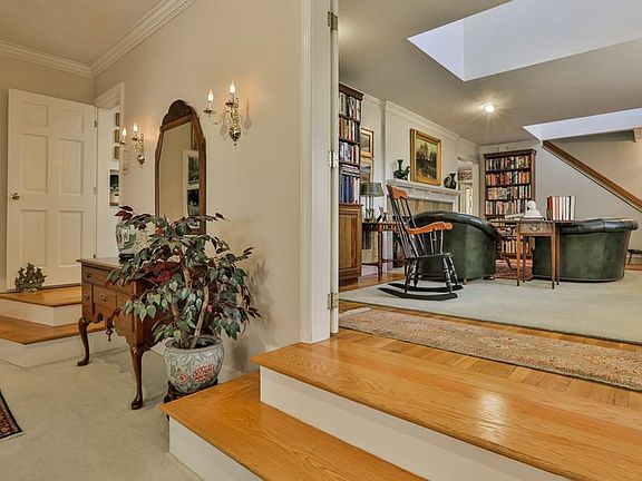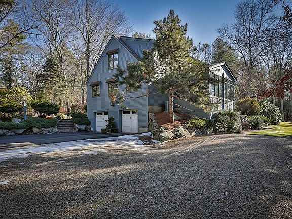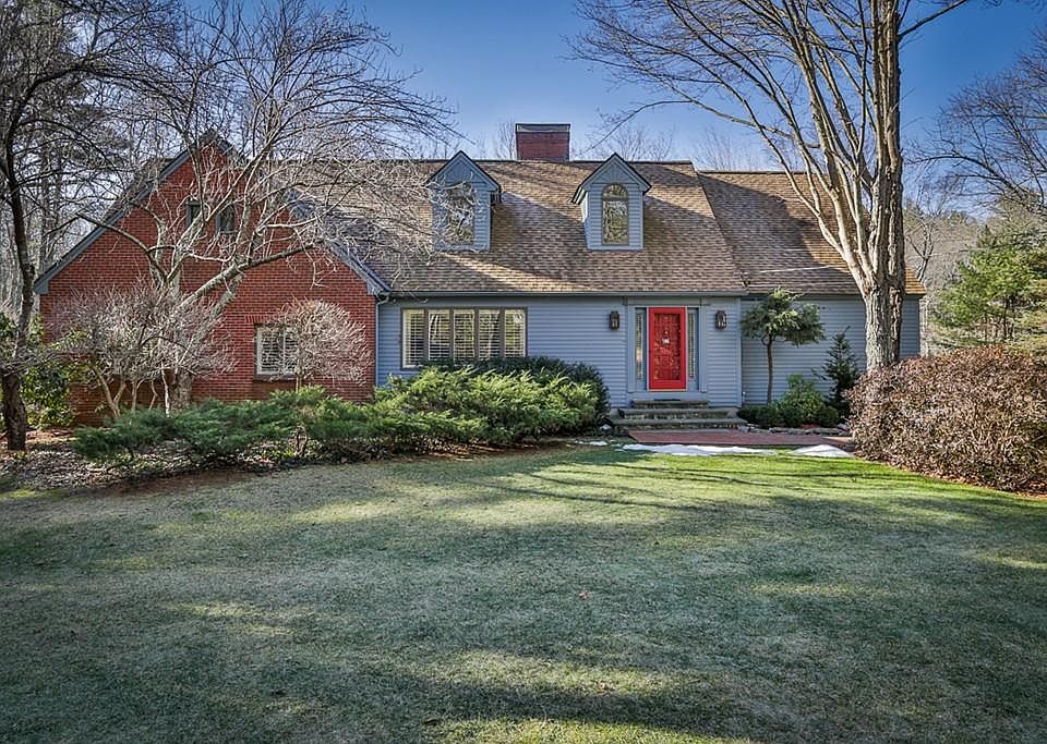 Sellers will entertain offers between $799,900 and $835,000. Exquisitely appointed Cape set on a lush 2-acre lot, featuring 4 bedrooms, 4 1/2 baths, & a 2-car garage.The kitchen is the heart of the home with custom cabinetry, double wall ovens, stainless steel appliances, center island, dining area with french doors leading to a beautiful cathedral-ceiling year-round sun room where you can enjoy your morning coffee or unwind after a long day with the tranquil sounds of nature overlooking your backyard brook. First floor bedroom suite with full bath, library with gas fireplace, sunken living room with french doors to patio, custom shutters throughout, formal dining room with built-in cabinetry & crown molding. Upstairs is the master suite with fireplace plus a solarium overlooking beautifully landscaped yard, and 2 other bedroom suites with full baths. Maintenance-free exterior with Hardiplank siding, full irrigation system, alarm system, A/C & newer gas heat.