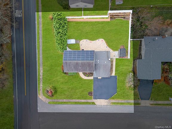 Incredible opportunity in the highly desirable Lake Grove Village, perfectly positioned in the sought-after T-section, offering sewer and sidewalks on an oversized corner lot. This expanded colonial immediately impresses with beautiful vinyl siding, a brick front facade, and a garage conversion with its own separate entrance, full bathroom, and certificate of occupancy—ideal for extended living or flexible use. The gorgeous home features real owned outright solar panels, practically off the grid. The property features an expanded blacktop driveway with Belgium block border and cement skirt, providing exceptional off-street parking. The private backyard is fully enclosed with beautiful vinyl fencing and enhanced by mature landscaping, a large stamped concrete patio perfect for entertaining, a stone retaining wall, and two oversized storage sheds. Inside, the open floor plan showcases beautiful hardwood floors throughout, a formal living room, custom molding and recessed lighting throughout, a spacious dining room, and an updated chef’s kitchen with grey bottom and white top cabinets, subway tile backsplash, quartz countertops, stainless steel appliances, an LG refrigerator, and a propane 5-burner stove. The first floor also offers a dedicated mudroom with washer and dryer and a separate entrance, plus an additional half bath off the kitchen. Upstairs, the enormous primary suite features hardwood floors, double closets and an updated primary bath with a glass stand-up shower, while the additional bedrooms are generously sized with hardwood floors and the hallway bath includes a tub and glass shower. Additional home features include professionally updated windows in select areas including the bathrooms and front of the house, one electric meter, three heating zones, pull-down attic stairs, a four-zone sprinkler system, 150-amp electrical service, a full unfinished basement with high ceilings and updated windows, a Weil-McLain boiler with Riello head and water storage tank only two years old, white PVC fencing, LED lighting, crown molding, cameras and alarms, and excellent closet space within the garage conversion. This rare offering delivers space, flexibility, and tremendous value in one of the most desirable pockets of Lake Grove.