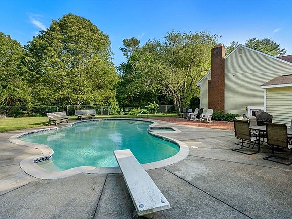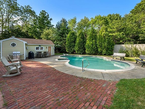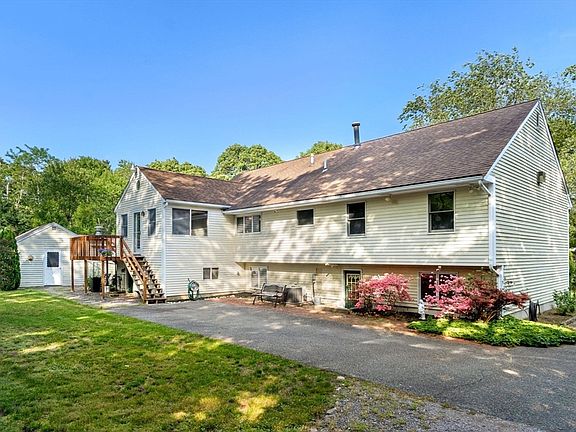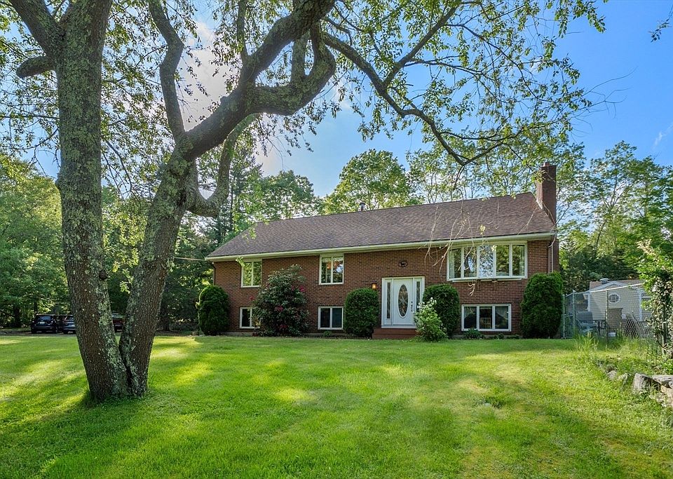 Spacious 54' oversized split entry raised ranch on a private 1.4 acre lot. Front entrance opens to tiled foyer leading up to a fireplaced living room w/gleaming hard wood floors and large bay window making it light and bright. Open floor plan flows to dining room w/hardwood floors and kitchen w/counter seating and stainless appliances. Plenty of room to accommodate family and entertaining. 16' x 7' back deck off den w/vaulted ceiling and beams. Enjoy the comfort of stepping out of the shower onto radiant heat flooring in the master bath. 3 bedrooms on the 1st level w/4th on lower level as well as 3rd full bath. Great room in lower level could be used for playroom, game room, entertaining...plenty of space there! Family room in lower level w/raised hearth fireplace and separate wood stove. Sliders lead to gunite in-ground pool and large cabana/shed. Kitchenette off family room provides easy access to food/drink while poolside. In-law apt. potential w/separate entrance.
