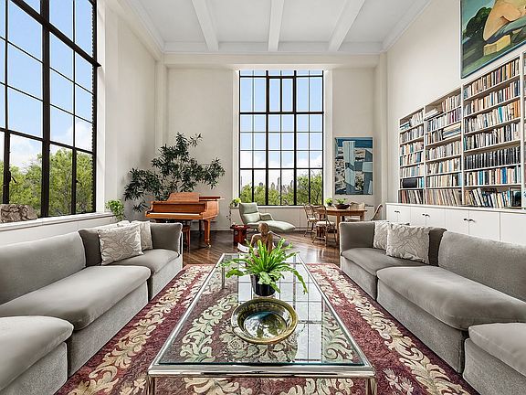 Entertain in style in the dramatic corner great room distinguished by airy 18’9” beamed ceilings, and 10’ windows showcasing views across Central Park. Adjoining is a large formal dining room overlooking greenery, with plenty of room to accommodate a large table for hosting guests. Down the hall you’ll find ample closets, a powder room, washer-dryer, and well-appointed windowed kitchen with a casual eat-in area.